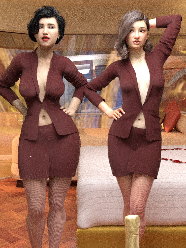 特別室と呼ばれるそこは、キングサイズのダブルベッドが2つ置かれた4P用の部屋である。2人の美熟女は高いハイヒールを履き、上質だがスカートの丈が極端に短く、身体の線がはっきりと見えるスーツを着て部屋の中央に立たされている。
